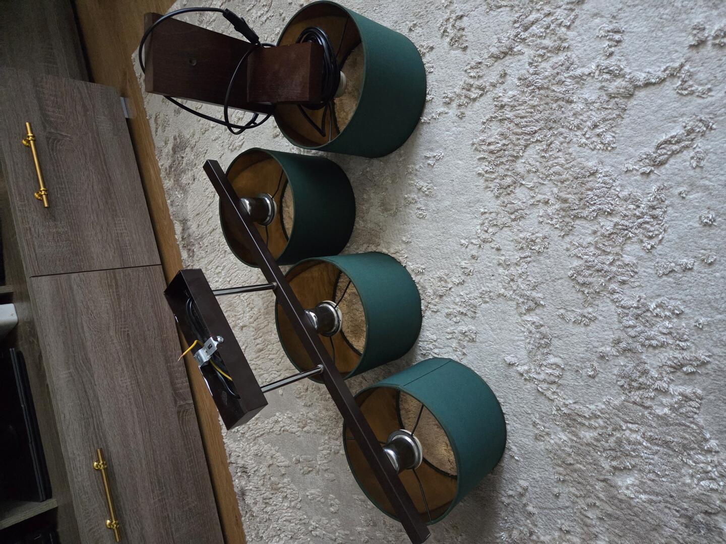 Sprzedam ładny żyrandoli i lampkę ( kinkiet), abażury zieleń butelkowa że złotym środkiem. Stan bardzo dobry. Cena za wszystko